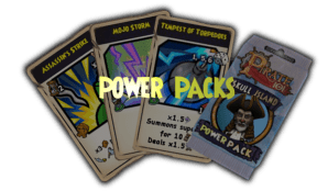 Power packs include five cards with random powers from Pirate101. These cards are slightly modified from the ones in game, including accuracy ratings* and damage in multiples (i.e. x1, x2) since the cards cannot automatically update based on your weapon damage.