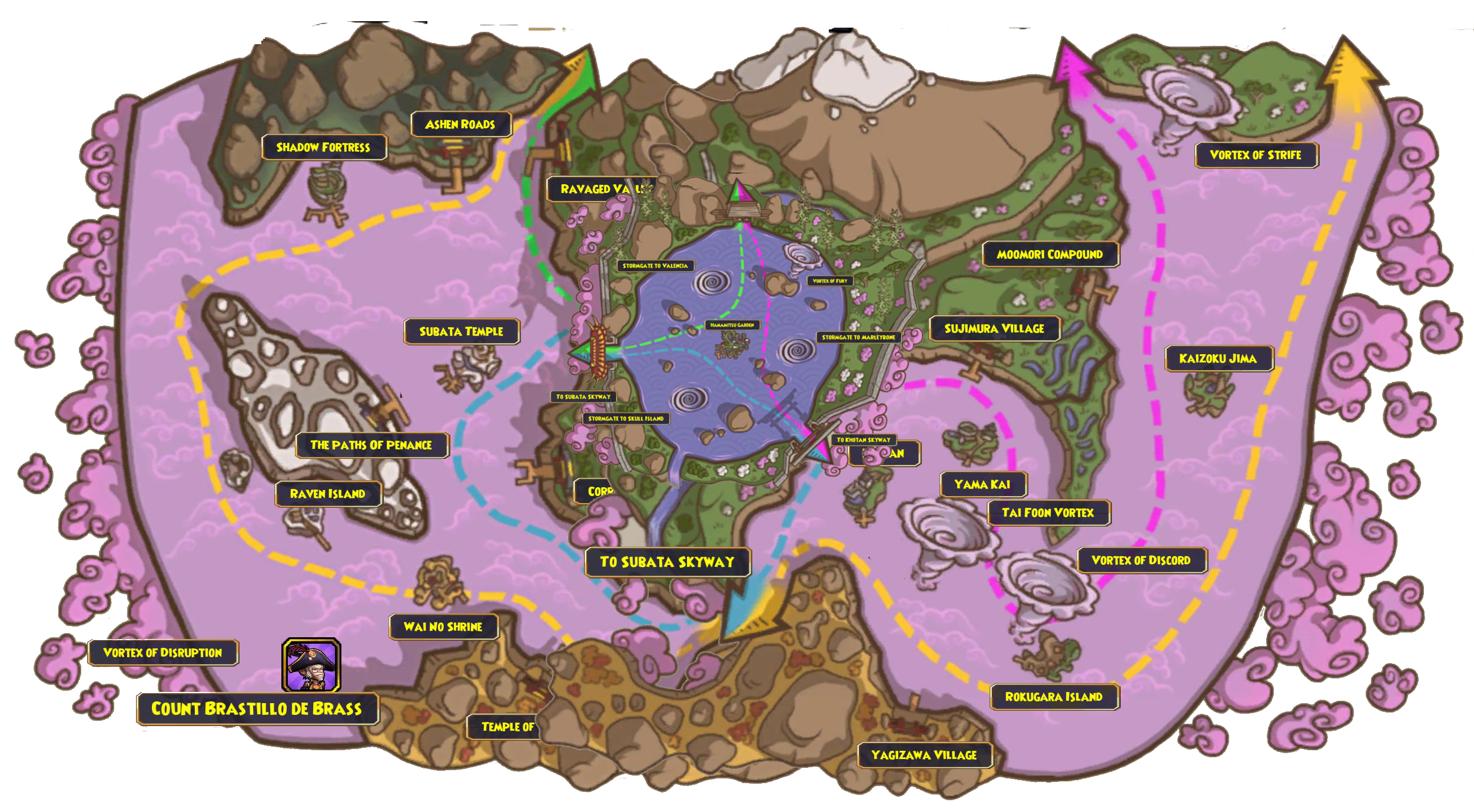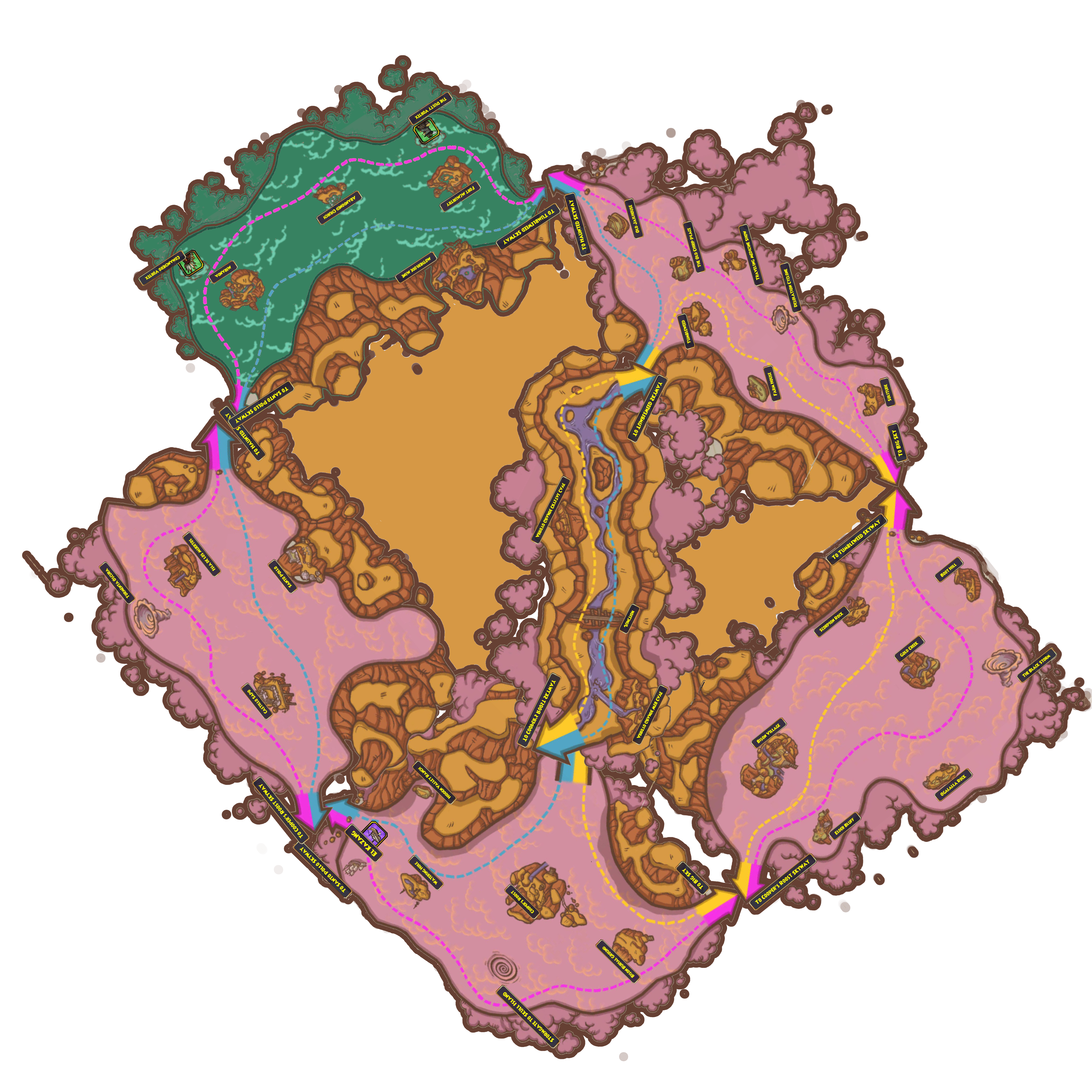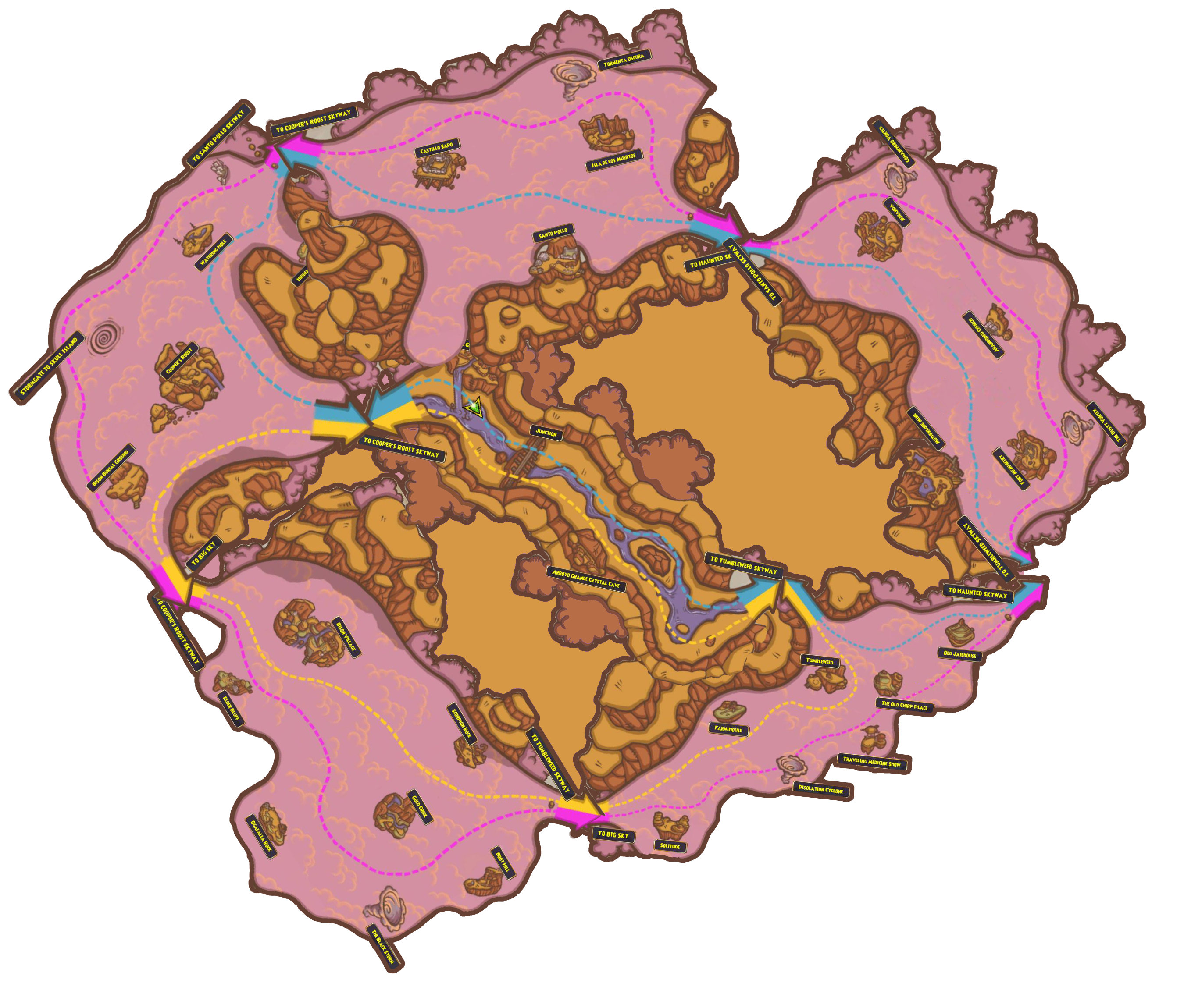 I have completed all of the world maps and updated my Cool Ranch map to create a full map of the worlds. The version of the map pictured above has the map background and spiral threads marked. To view other types of the map or individual maps, click the links below.