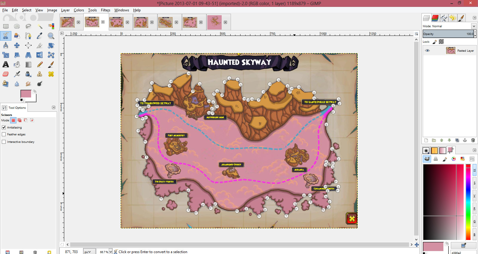 That was really fun to make! What I did was I took screenshots of all the skyways’ maps, then put them into GIMP. I selected the map part, which means I didn’t select the parts around the edges, then did Select > Invert to select only the bars on the sides. I deleted those then (after inverting the selection again) did Image > Crop to selection. After that, I selected only the skyway part, no map wanted. That was pretty hard.