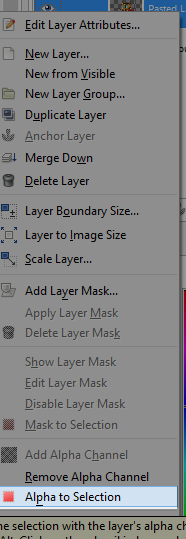9. Then click on the black, it will select it all. Press Delete on your keyboard and it will remove all of the ugly black stuff. Then go to Select ➜ None. Then go back to your handy Layers widget and right click the “Pasted Layer” then press “Alpha To Selection.” This will select all of the Pirate101 logo. (Picture)