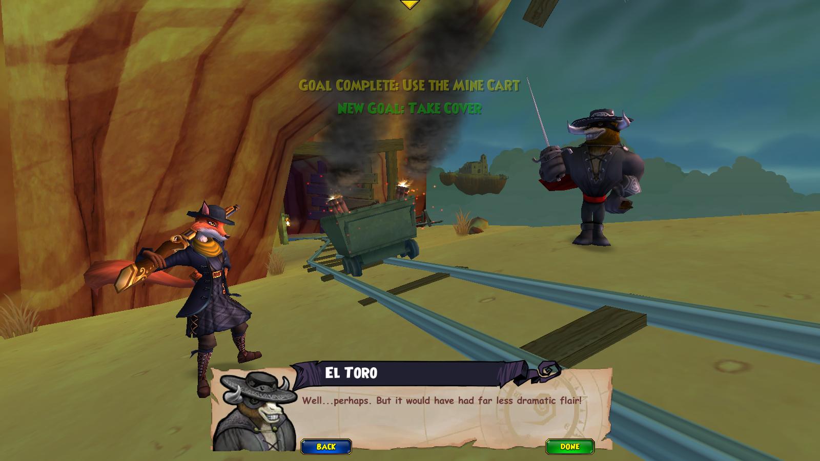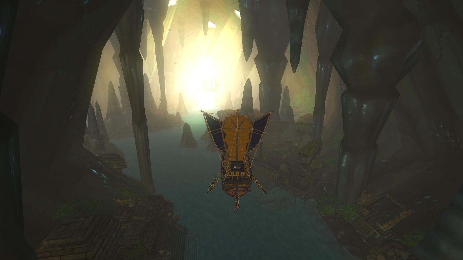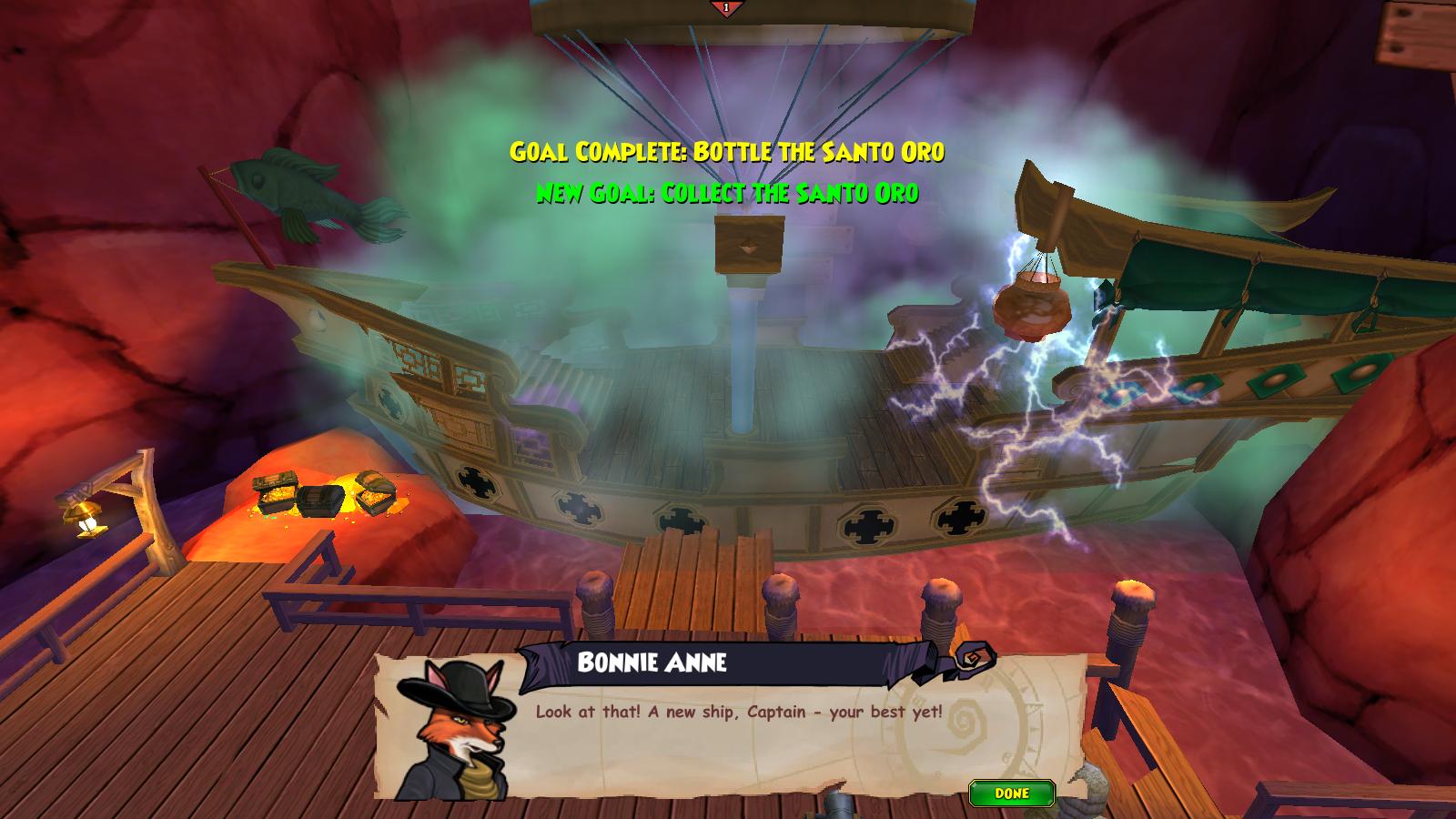 There’s the final battle! He’s done for. Now, with Captain Blood out of the way, the path to the treasure has never been so clear. Time to go into the Motherlode Mine to get the piece of the map. But before that, we have to fight 12 more ghost ships. (I should have known…) Well after that, it was time to go look for Captain Blood’s Treasure in Motherlode Mine! It said it was only a half-hour dungeon, so that was good. I went and found the Santo Oro, Marco Pollo’s ship, which was a pretty cool MooShu skiff. The way to the treasure was blocked off, so we went to blow it up with dramatic flair! 😉