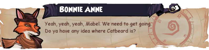 After you’ve left Boochbeard’s ship and docked onto Skull Island, you’ll be in Cpt. Avery’s Office. He thinks that it wouldn’t be fair to just give you what you need, so he says to help him out to get a ship. He wants his Jade Amulet back, which Fin, one of his crew, stole, then ran off to Skull Mountain while arousing the Troggy tribes. Now the Troggies have stolen the gunpowder of the pirates trying to stop them, and are bombarding the towns on Skull Island. Avery sends you to Rigby, who is near Skull Mountain. He tells you more about the problem and leads you across a bridge to the Mountain. There, you meet Bonnie Anne, a Fox Musketeer. She wants you to defeat some Troggies, and then she’ll help you look for Fin. (Note: All image captions are below the images.)