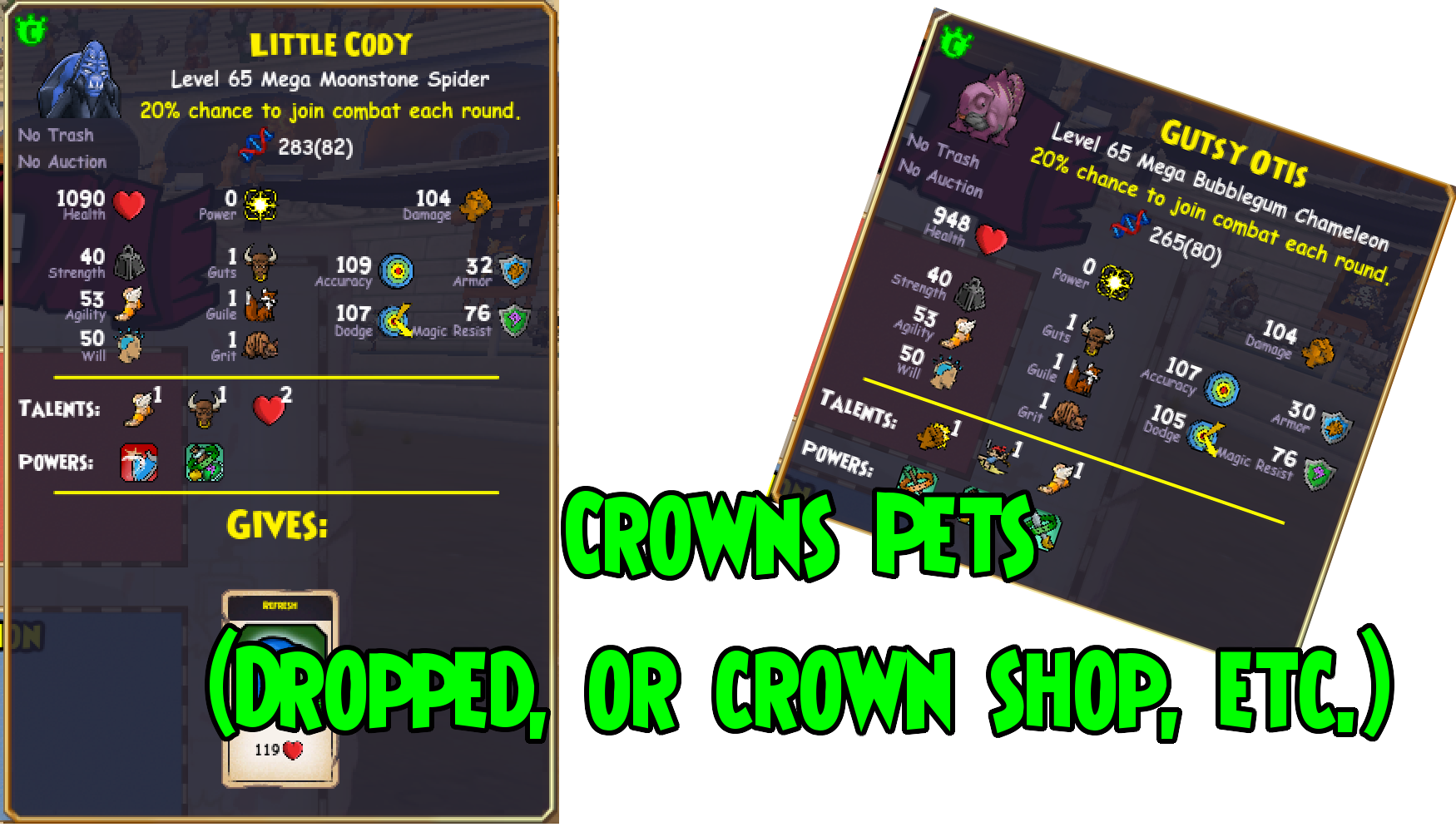 Pets that have the crown shop icon (top left corner) mean that they are or will be in the crown shop, bundle, pack, etc. These pets are also dropped, though, and have not yet been seen in-game. These could be dropped anywhere or could be future plans as bundles or crown shop pets.