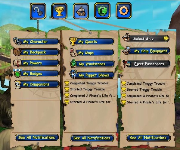 These are the task-bars at the top of the screen, which appear when you mouse over the arrow at the top of the screen and click on the corresponding icon. I showed all of the dropdown menus at once. (You can’t do this in-game, I edited the photo).