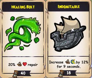These look similar, right? These are Neutral Abilities, and can be used at any time. These are determined by the Wheel and Sails of your ship. The healing abilities (Wheel) usually have a longer cooldown time and heal your ship a certain percentage. If my ship had 1,000 Hull Integrity, (if you don’t know what that is, read this), and I used the above ability, Healing Bolt, my ship would repair 200 health. What’s the second ability though? Sails’ abilities are usually speed boosting abilities, or dodge abilities. This is a dodge ability. When your ship “dodges” an attack misses. So this boosts your dodge by 12%, but only lasts nine seconds, which is half of the cooldown time.