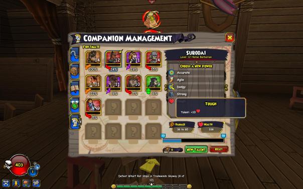 Welcome to the first “How To” post! In this post series, I will be explaining the mechanics of how to do certain things in Pirate101. This time, I’ll tell you the schematics of getting companions, but have a special focus on promotions and talents! To start us off, here’s a picture of Companion Management. Go to the top menu, then the hook, them My Companions to open this or just press “U” on your keyboard. (This picture was posted earlier on this blog.)