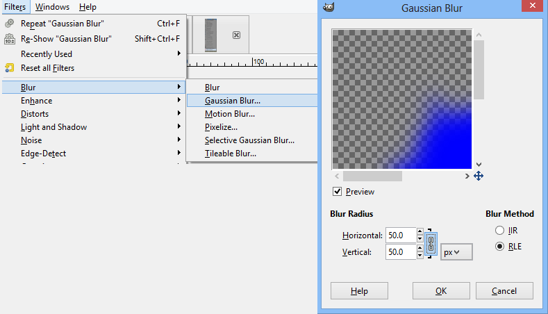 Effects or Filters are built-in to GIMP and add things to your image that you wouldn’t be able to do easily without it. The one that I use most is in the Blur section. (Filters > Blur) It’s called Gaussian Blur, and it is the simplest blur. I used in the last post, and it evenly spreads, or blurs, the picture as far as you set the “blur radius.” The higher the radius, the more blurry and the farther the colors move outward. I used this in the last post for the glow effect because if you use this on solid colors (on their own layer) it gives the edges a fuzzy look.